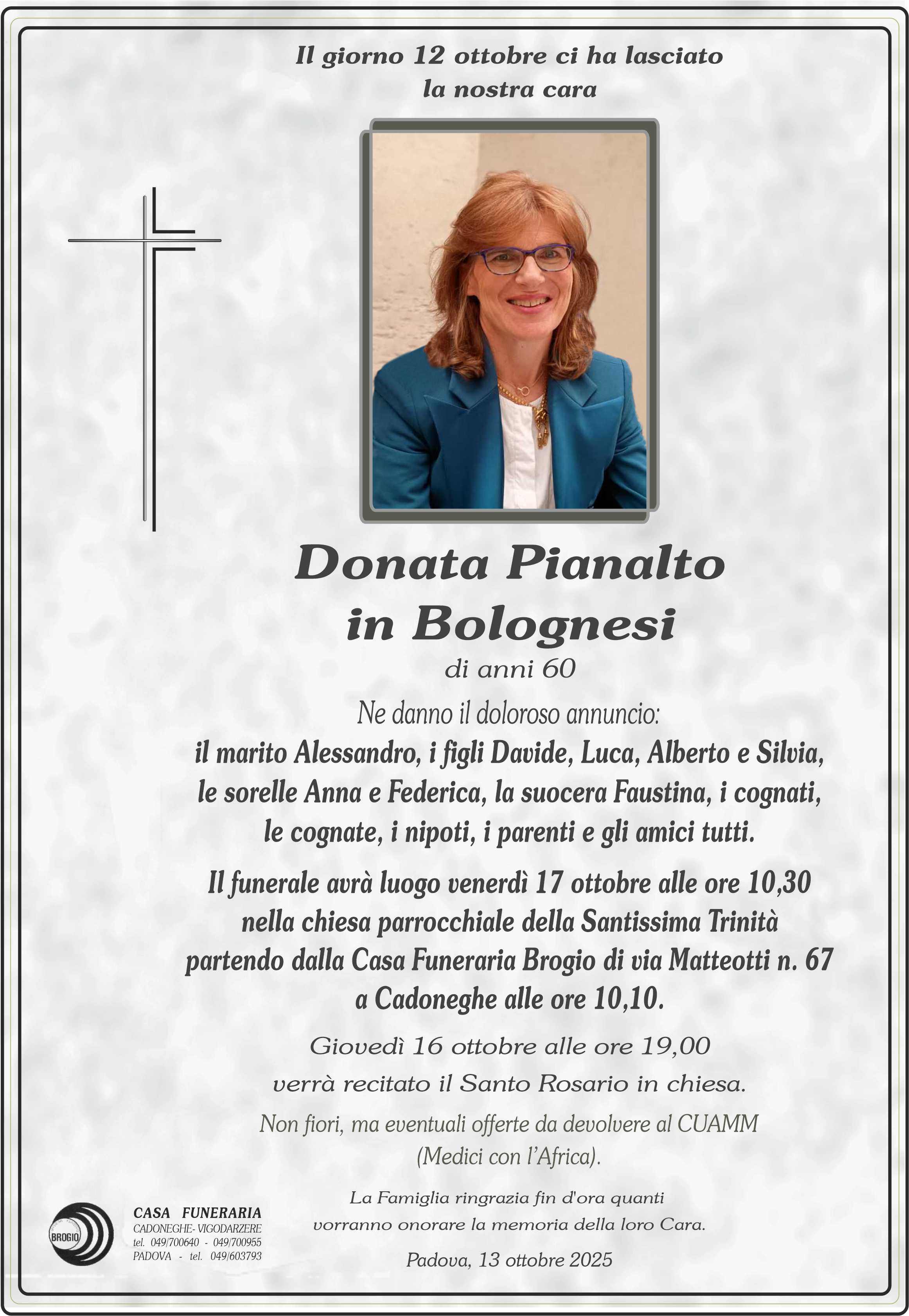 Donata e suo marito Alessandro sono stati i miei compagni del liceo Marchesi . Con Donata abbiamo studiato , condiviso paure e soddisfazioni , esperienze e vacanze e siamo cresciute insieme .Poi ci siamo un po’ perse con scelte universitarie diverse ,ma oggi pensare che non c’è più mi rattrista molto .Spero che possa riposare in pace . La ricorderò sempre corretta , gioiosa e piena di vita .Ad Alessandro e ai suoi ragazzi un abbraccio speciale pieno di nostalgia