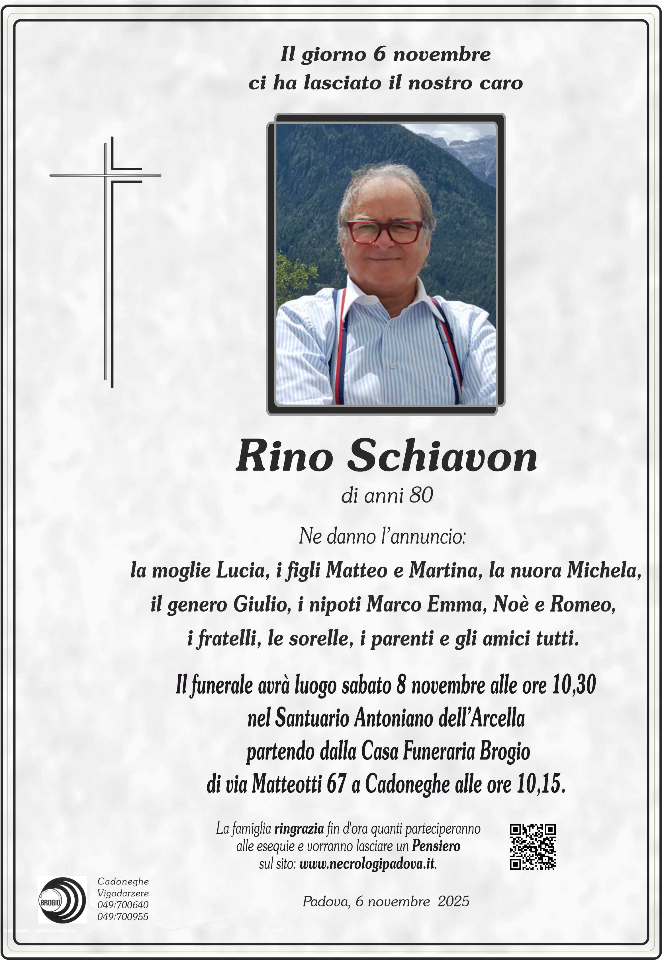 Con profonda stima desidero ricordare il signor Rino Schiavon, di cui ho potuto apprezzare la professionalità, l’equilibrio e l’attenzione verso le persone. Sincere condoglianze alla famiglia