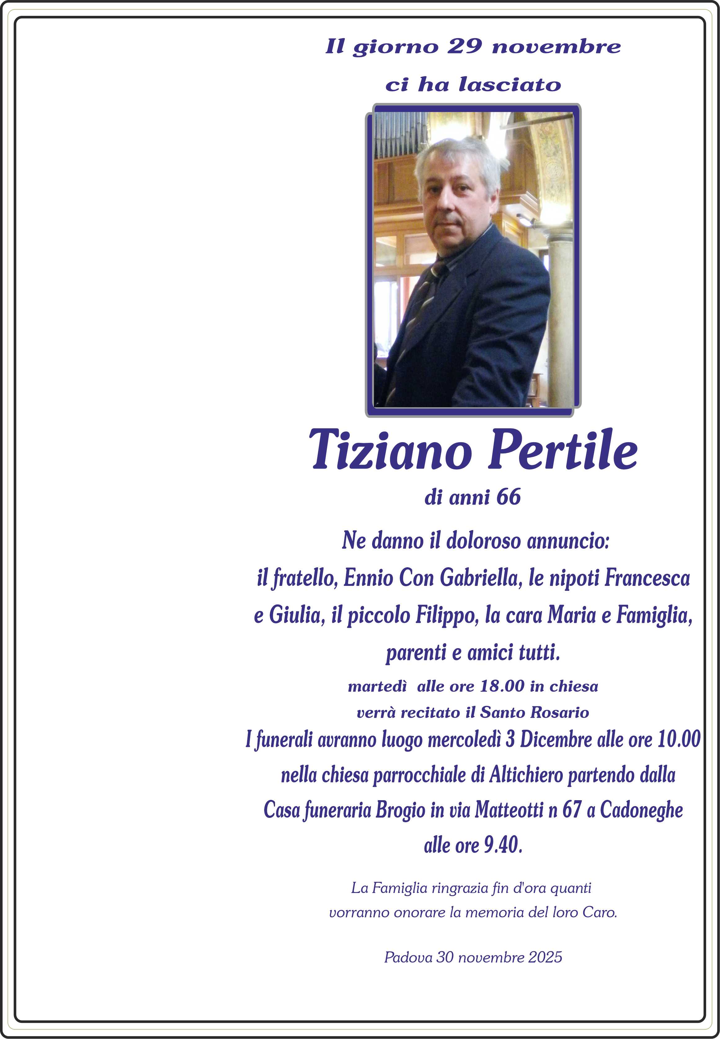 I familiari ringraziano anticipatamente tutti coloro che parteciperanno alla cerimonia funebre